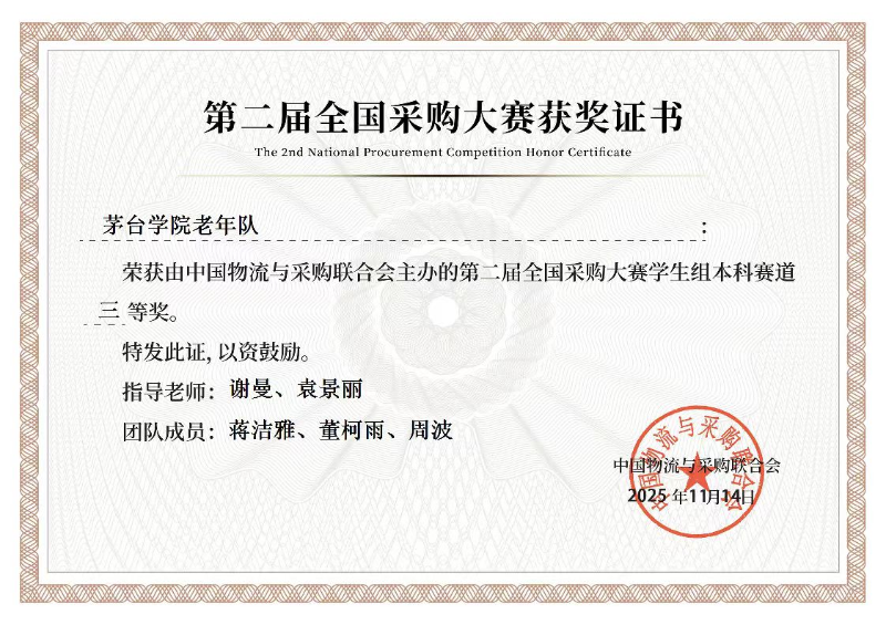 The student group finals of the 2nd National Procurement Competition recently concluded successfully. Students majoring in Logistics Management of Moutai Institute delivered outstanding performances and returned with honors 青娱乐极品视觉盛宴. With a maximum of two teams allowed per institution, a total of 442 teams competed in the undergraduate track. After intense competition, the two teams from our institute won the first prize and third prize respectively.