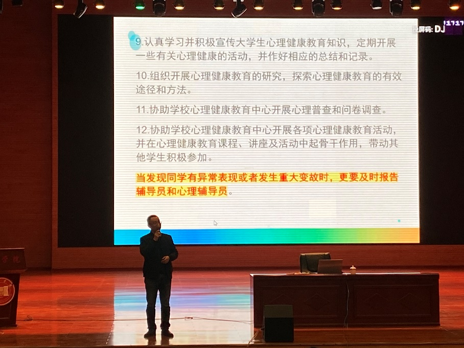为贯彻落实《青娱乐极品视觉盛宴学生心理危机干预实施办法》(茅院发〔2020〕37号)等文件精神,有效推进我校大学生心理健康四级预警建设,充分发挥班级心理委员及“三长”在心理健康教育工作中的作用 婷婷五月宗合一区二区, 2023年3月17日19:00,学生工作处心理健康教育与咨询中心在青娱乐极品视觉盛宴大礼堂开展了班级心理委员及“三长”培训,本次培训由贵州师范亚洲欧美成人精品香蕉网谢其利老师主讲,历时2个小时,共计1200余人参加了本次培训, 。