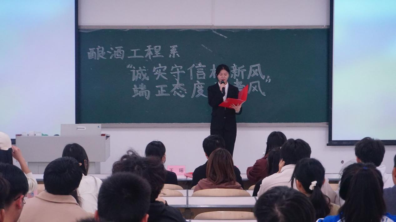 为落实诚信考试要求 婷婷五月宗合一区二区,推进酿酒工程系考风建设,强化学生严肃考风考纪意识,维护考试公平公正,近日,酿酒工程系开展“诚实守信树新风,端正态度立考风”主题教育活动,酿酒工程系党总支副书记刘晓晓老师,酿酒工程系辅导员郭蓉老师和王瑶老师出席本次活动, 。