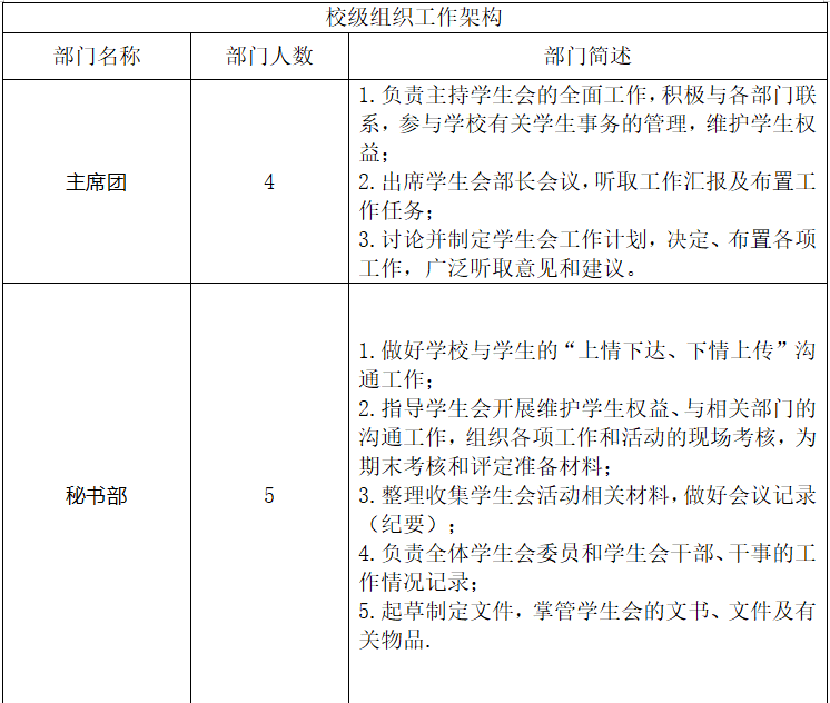 第二十条 学生会实行主席团分工负责制。主席团下设工作部门,各工作部门实行部长负责制。
