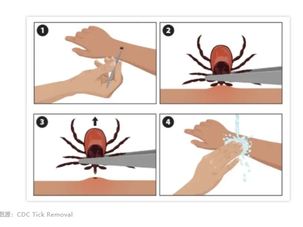 6.万一被蜱虫叮咬,可以用一把尖细的镊子,紧贴皮肤下按,贴得越紧越好,夹住蜱虫的头部,垂直往上拔除蜱虫。拔出来后记得检查虫体是否完整,假如蜱虫头部留在了体内,则需要去医院皮肤科处理;倘若拔除的蜱虫头部完整,消毒处理即可,密切观察是否出现发热等症状,如无不适,则无需前往医院。