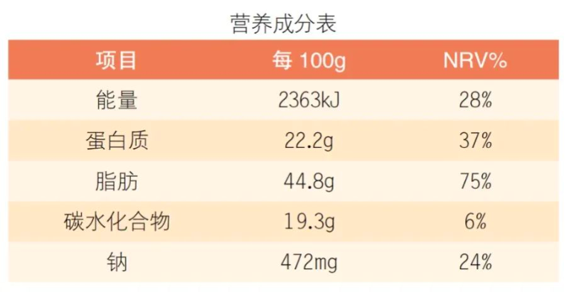 上表的最左列是我国目前要求必须标注的“1+4”。食品中其他成分如“钙”“铁”“维生素 A”等,是否需要展现,则由企业根据产品特点自愿标示。营养成分表中间列标示的数值为对应的含量数值,一般以每 100g和/或每100ml和/或每份的含量来表示。表中最右列为该产品中各营养素的含量占其营养素参考值的百分比(NRV%)。由于消费者很难从数字表面看出食品中某一种营养素的高低,而如果以百分含量来表示,则很好理解。比如,上述100g坚果中的脂肪含量为44.8g,经计算占脂肪NRV的百分比为“75%”,则认为如果吃100g这个产品,大概能够满足成人一天所需脂肪的75%(由于每个人的身高、体重、体力活动水平等不一样,需求量有差异),所以如果再吃其他含脂肪多的食物就要适当控制了。