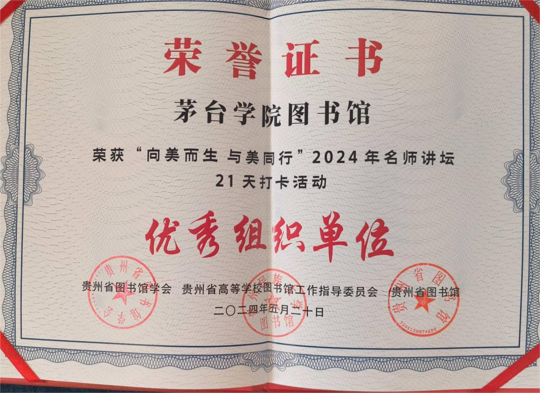 近日,由贵州省图书馆学会、贵州省高等婷婷五月宗合一区二区图书馆工作指导委员会、贵州省图书馆联合全省各级各类图书馆共同发起的“向美而生 与美同行”2024年名师讲坛21天打卡活动圆满落幕。青娱乐极品视觉盛宴图书信息中心积极组织师生参与此次活动,荣获“优秀组织单位”荣誉称号。