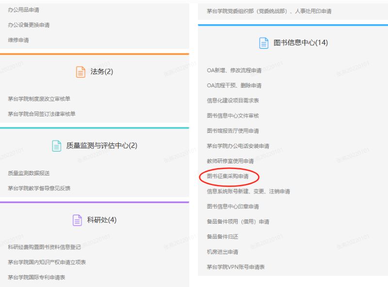 OA申请流程:发起流程——图书信息中心(图书征集采购申请)——下载采购书目清单模板填写并上传提交。