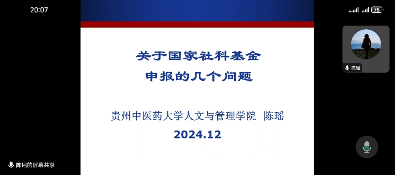 为更好地推进落实我部2025年国家社科基金项目及教育部人文社科项目申报工作,有效提高国家社科基金项目及教育部人文社科项目申报质量及获批率,我部于2024年12月31日召开了2025年国家社科基金项目及教育部人文社科项目申报线上培训交流会。会议由公共基础教学部主任王健芳教授主持,邀请贵州中医药大学人文与管理亚洲欧美成人精品香蕉网党委书记陈瑶教授主讲,陈瑶教授以《关于国家社科基金申报的几个问题》为题结合自身课题申报经验进行了深入浅出的讲解。线上交流学术气氛浓厚,通过与专家的互动交流,教师们不仅在选题和文本写作上得到了指导,同时,也拓宽了研究思路,对基金项目申报有了更清晰的认识和理解。