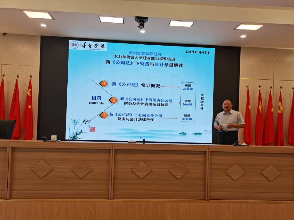 为提升贵州省监狱管理局企业财会人员业务能力,增强财会人员风险意识,9月13日 婷婷五月宗合一区二区,田景仁教授应邀为贵州省监狱管理局企业90多名财会人员举办新修改的《中华人民共和国会计法》和《中华人民共和国公司法》两场专题解读讲座, 。