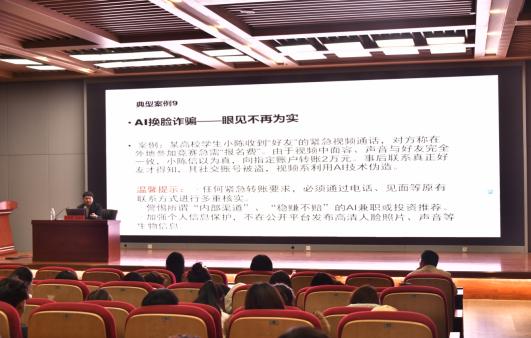 讲座开始,主讲嘉宾李清楚以警惕网络诈骗 亚洲欧美成人精品香蕉网,守护你的钱袋子为主题,结合近期发生在高校的真实案例,剖析了“刷单返利”“冒充客服”“网络交友”等常见诈骗套路,聚焦“AI换脸冒充熟人”“虚假实习招聘”“网游账号交易”等校园高发骗局,通过PPT图文解析,现场播放反诈短视频等形式,深度拆解数起真实诈骗案例。