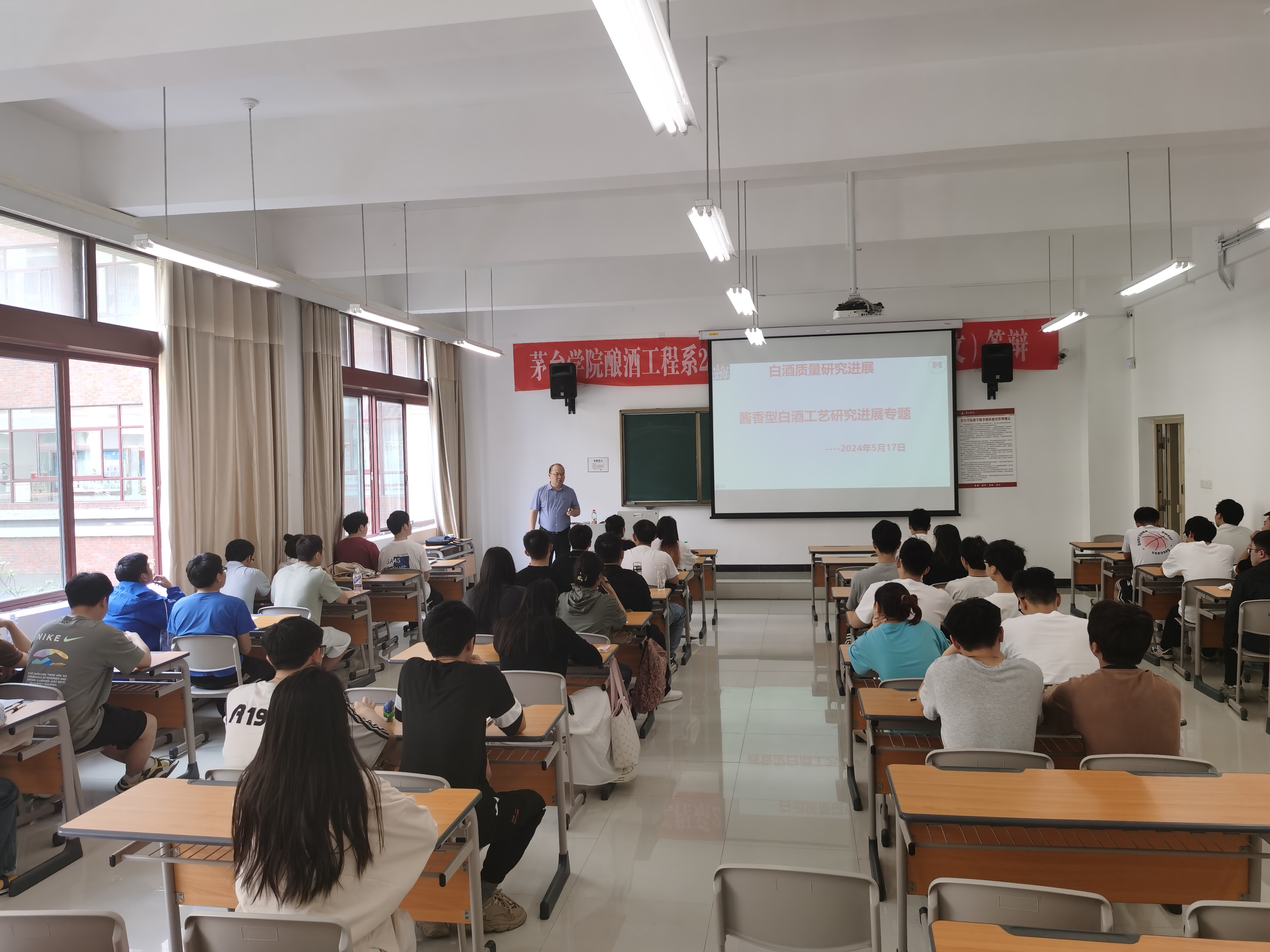 2024年5月17日 婷婷五月宗合一区二区,贵州茅台股份有限公司制曲六车间主任范成伍到我校为我系学生授课,讲授关于“酱香白酒工艺研究进展”的相关内容,范成伍主任重点围绕近些年酱香型白酒工艺取得的突破和研究进展等内容展开本次授课,在授课的过程中,范成伍主任结合自身丰富的工作经验,将课堂理论与实际生产紧密结合,让枯燥的理论知识变得生动,加深学生们印象,让学生更好掌握知识,此外,范成伍主任以自己切身经历,劝诫学生要珍惜当下学习时光,提升自我知识储备,为毕业后进入工作岗位打下坚实的基础。