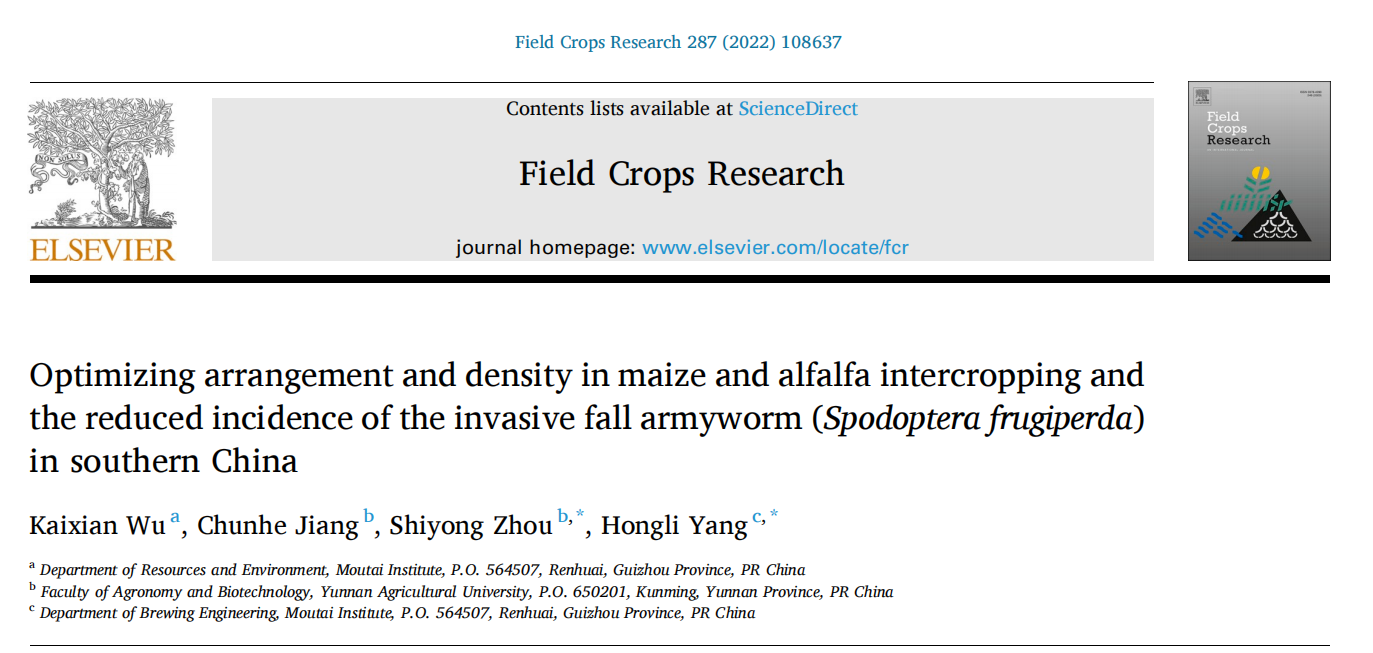 酿酒工程系杨红丽老师团队在农业领域著名期刊《Field Crops Research》(中国科亚洲欧美成人精品香蕉网一区SCI收录,IF:6.145),以青娱乐极品视觉盛宴为第一单位在线发表了题为“Optimizing arrangement and density in maize and alfalfa intercropping and the reduced incidence of the invasive fall armyworm (Spodoptera frugiperda) in southern China”的科技论文。该研究针对山地农业生产中存在的机械化适合度低,水土流失严重,农牧耦合性差等突出问题,改进了玉米苜蓿间作体系的群体结构,创新设计了基于窄带模式的行比和密度配置,突破传统模式中苜蓿仅用于覆盖作物的局限性,实现了粮食和饲料的协同生产,为山地可持续农业生产提供了新技术。同时,研究首次发现并报道了间作苜蓿可降低玉米上的草地贪夜蛾虫害发生,其控制率达80%。草地贪夜蛾是全球性重大迁飞性农业害虫,可对水稻、玉米、小麦、高粱等多种农作物造成严重经济损失,目前尚无有效的非化学防控措施,本研究为草地贪夜蛾及生物学特性相似农业害虫的绿色防控提供了一种有潜力的技术选择。