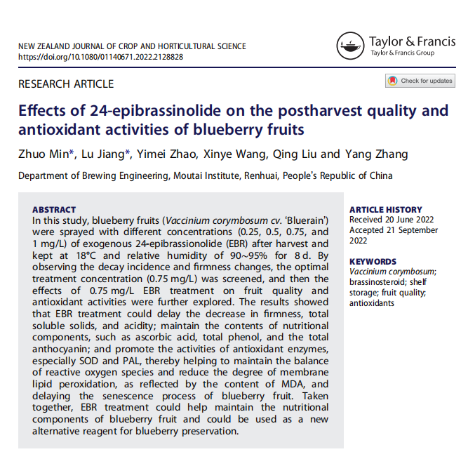 我系葡萄与葡萄酒工程教研室果酒原料品质提升研究团队,以第一单位第一作者在《New Zealand Journal of Crop and Horticultural Science》(新西兰作物与园艺科学杂志 亚洲欧美成人精品香蕉网,简称NZJC)发表题为“Effects of 24-epibrassinolide on the postharvest quality and antioxidant activities of blueberry fruits”的研究论文,该论文的第一作者为闵卓和江璐(共同第一),该研究工作得到贵州省科技支撑计划项目(黔科合支撑 [2020]1Y132),贵州省教育厅青年人才成长项目( KY [2020]236)的支持和贵州省大学生创新创业训练计划项目(202114625003)的共同支持。