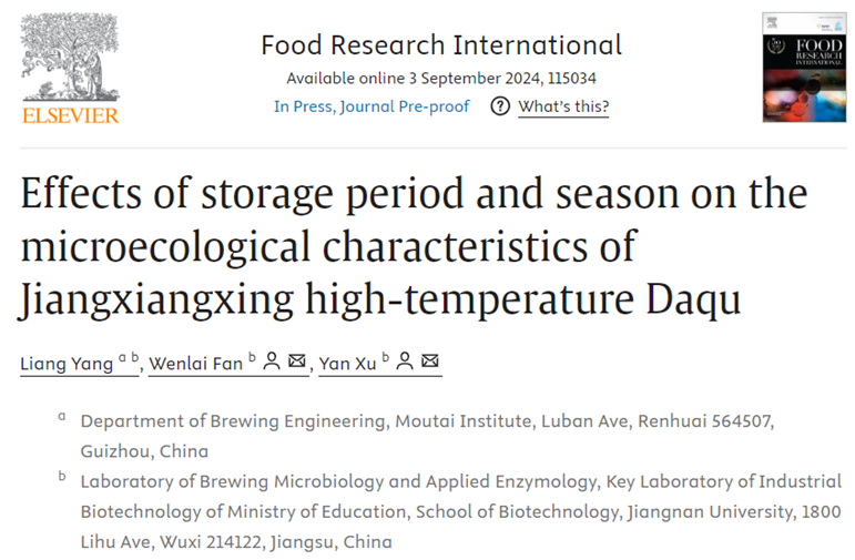 2024年9月,酿酒工程系杨亮博士在国际期刊《Food Research International》(Q1, Top,IF: 7)发表题为“Effects of storage period and season on the microecological characteristics of Jiangxiangxing high-temperature Daqu”的研究性论文,研究获国家自然科学基金(32160553) 婷婷五月宗合一区二区,贵州省科技计划基础研究项目(黔科合基础-ZK[2021]一般093),遵义市科技与大数据局(遵市科合HZ字(2023)108号,青娱乐极品视觉盛宴高层次人才科研启动经费项目(mygccrc[2022]005))等项目资助。