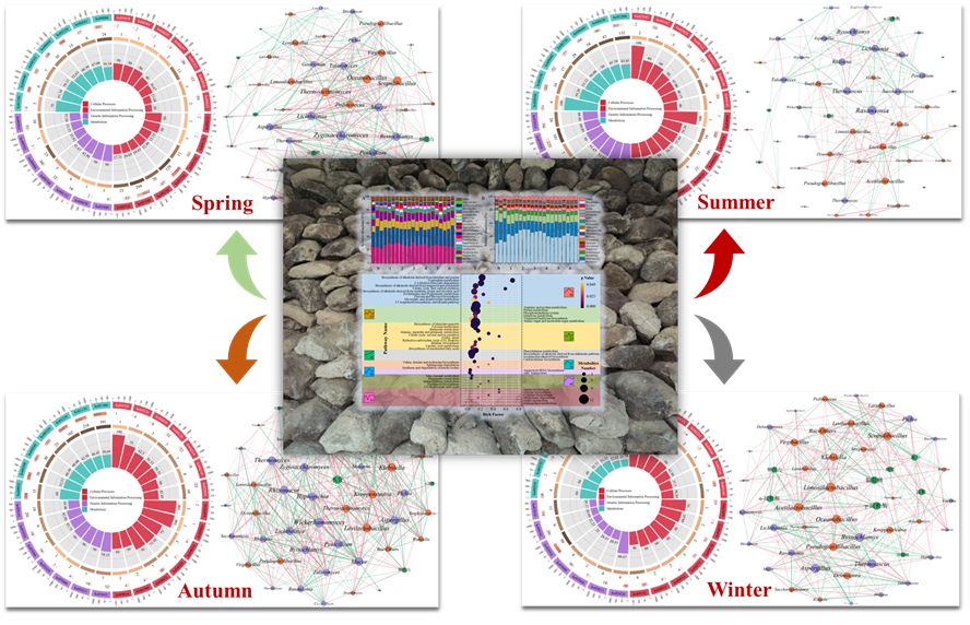 针对高温大曲在贮存过程中微生态稳态形成机制不清晰的科学问题及其在不同季节贮存后特性存在差异的现象,本研究采用宏基因组、非靶向代谢组学及宏蛋白质组学技术,解析了贮存期大曲的微生态演替规律,明确了大曲微生物群落对贮存环境的适应机制,以及不同贮存季节大曲微生态特性。研究发现,贮存期间,大曲中的Bacillus、Oceanobacillus、Staphylococcus和Aspergillus等相对丰度显著上升,Kroppenstedtia、Saccharopolyspora、Thermoascus和Thermomyces等相对丰度显著降低。化合物代谢在大曲贮存的前3个月内主要以小分子物质生成为主,后期转向氨基糖代谢,经5个月的贮存可达稳态。在贮存过程中,大曲微生物群落的同质选择(15,57%)及同质扩散(14,86%)组装均远大于发酵过程,且变量选择组装(29,43%)小于发酵过程,贮存过程中大曲微生态的空间分化不显著。在四季大曲中鉴定出的2509种蛋白质中,细菌蛋白质表达量是真菌的1,46倍,且夏曲中微生物的多样性及功能表达最为丰富,而冬曲中微生物群落表现出低多样性和低功能性,季节通过影响Bacillus subtilis、Oceanobacillus iheyensis和Aspergillus nidulans等微生物的功能表达进而影响大曲的功能分化,使得春曲的碳代谢和苯甲酸代谢能力更强、夏曲生物碱和酪氨酸代谢能力强、秋曲倾向于氨基酸合成和淀粉代谢、冬曲肽聚糖合成能力更强。调节贮存期内大曲水分或可减少不同季节温度差异引起的大曲微生态分化。 亚洲欧美成人精品香蕉网。