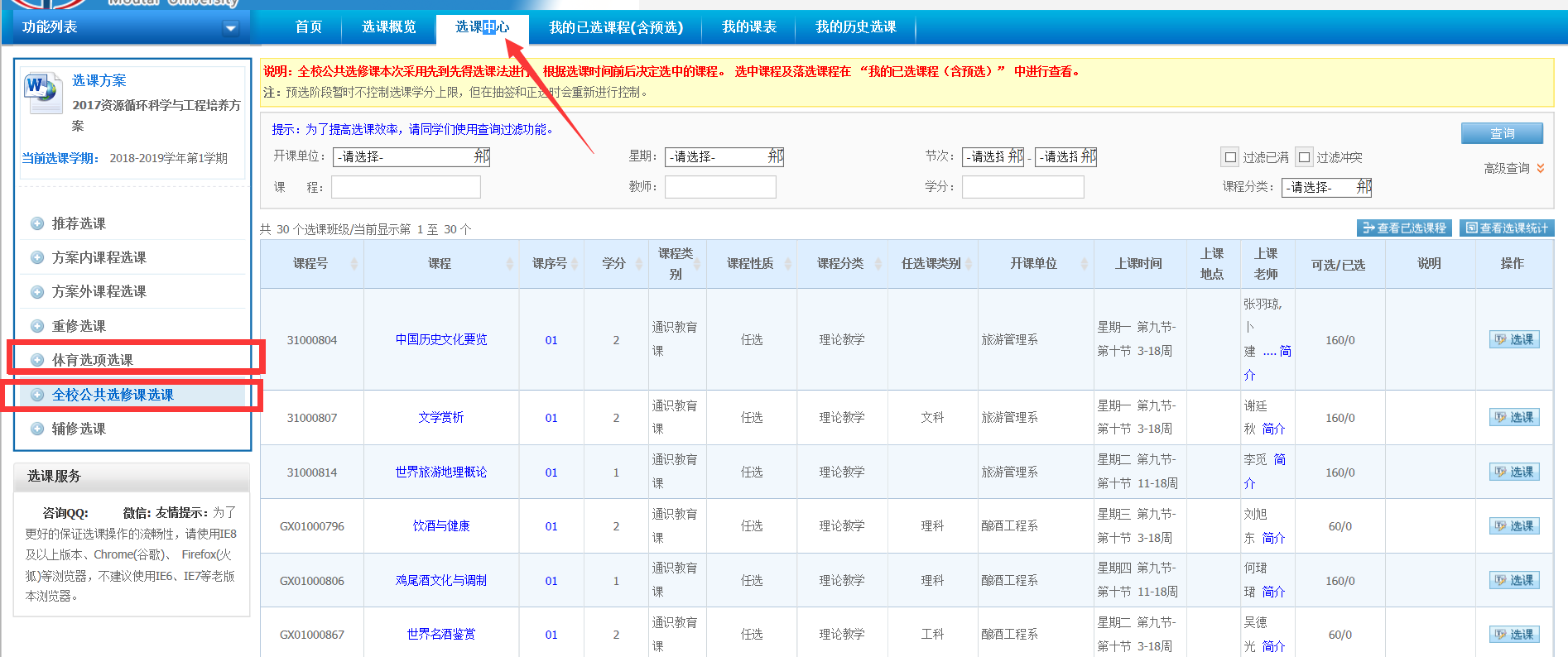 2.本轮选课涵盖全校公共选修课和体育选项选课。其中体育选项选课必须选择一个体育项目。