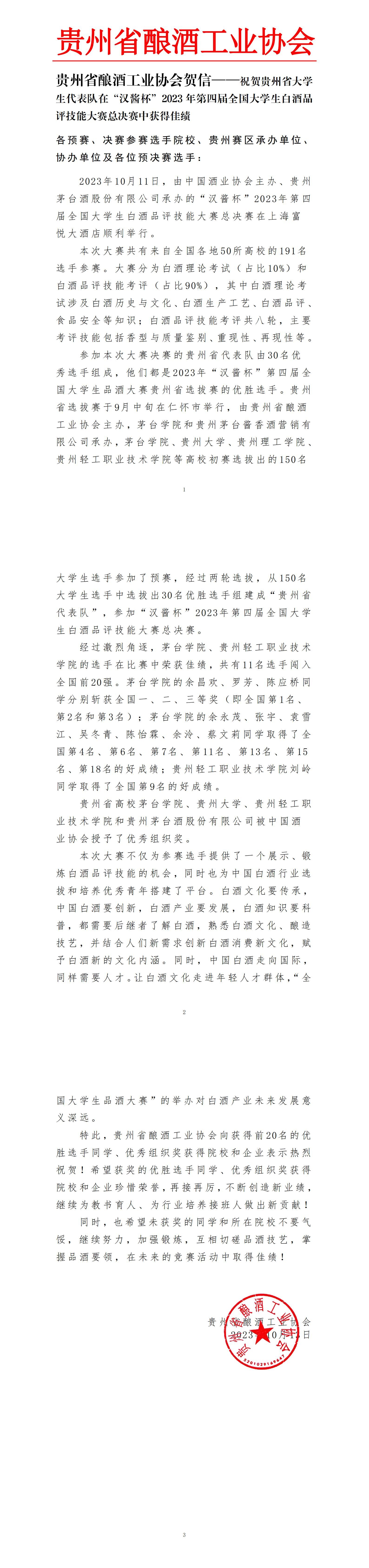 酿酒工程系学子在第四届全国大学生白酒品评技能大赛中荣获佳绩,贵州省酿酒工业协会发来贺信