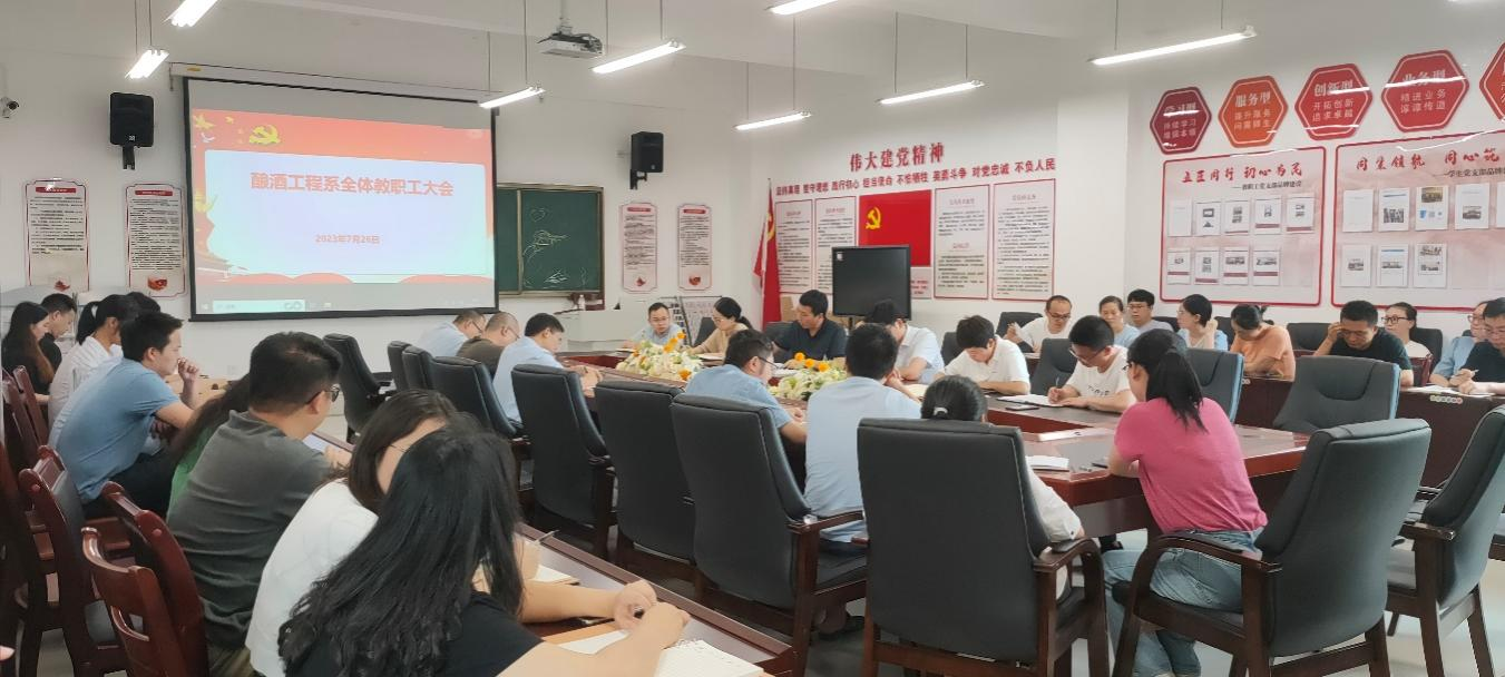 为顺利开展迎评工作,打赢合格评估攻坚战,酿酒工程系于2023年7月26日下午16:00召开了全系教职工大会。会议由我系党总支书记、系主任郭举同志主持,婷婷五月宗合一区二区党委委员、副校长张春林同志及我系全体教职工参会。