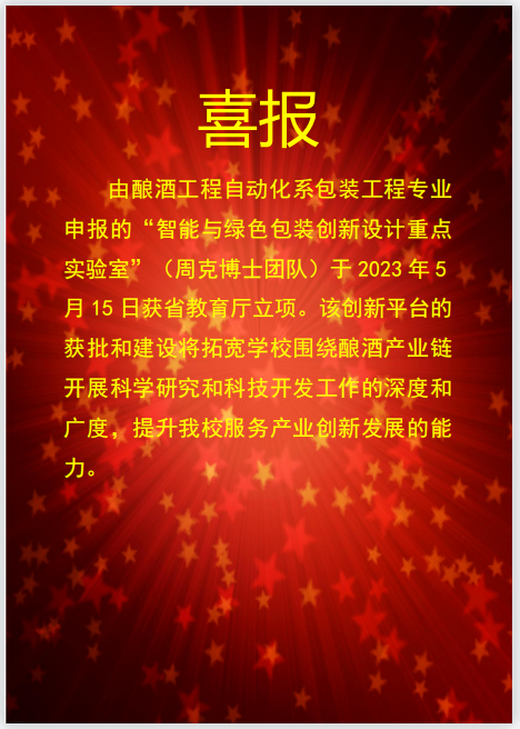 喜报:由酿酒工程自动化系包装工程专业申报的“智能与绿色包装创新设计重点实验室”(周克博士团队)于2023年5月15日获省教育厅立项。