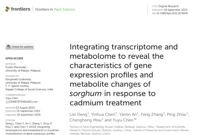 食品工程亚洲欧美成人精品香蕉网特色食品资源开发与利用团队教师邓力喜以第一作者在SCI 2区期刊《Frontiers in Plant Science》发表题为《Integrating transcriptome and metabolome to reveal the characteristics of gene expression profiles and metabolite changes of sorghum in response to cadmium treatment》的研究文章 婷婷五月宗合一区二区,该研究得到青娱乐极品视觉盛宴高层次人才科研启动经费项目(mygccrc[2023]009)和贵州特色食品资源开发及综合利用工程研究中心(KY(2020)022)支持。