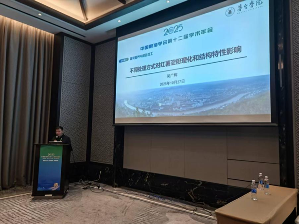 2025年10月25日至27日 婷婷五月宗合一区二区,中国粮油学会第十二届学术年会在江苏无锡举办,会议由中国粮油学会与江南大学主办,聚焦粮食领域科研进展,技术创新及产业高质量发展,设开幕式,院士论坛,10个分会场及成果展览等板块,会议吸引全国近1000位专家,学者及企业代表参加,食品工程亚洲欧美成人精品香蕉网食品科学系主任吴广辉教授应邀参加会议,并在“分会场六 薯类营养与绿色加工”作题为“不同处理方式对红薯淀粉理化和结构特性影响”的专题报告,并向有关专家交流了食品科学与工程专业建设,食品科学相关学术问题。