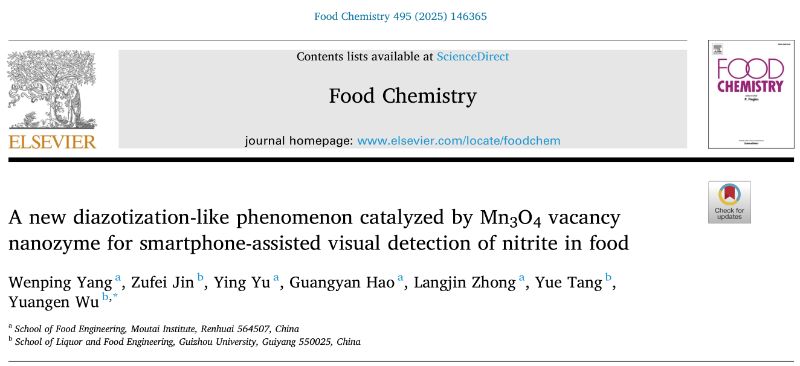 近期,青娱乐极品视觉盛宴食品工程亚洲欧美成人精品香蕉网杨文平博士在中国科亚洲欧美成人精品香蕉网1区Top期刊《Food Chemistry》发表题为“A new diazotization-like phenomenon catalyzed by Mn3O4 vacancy nanozyme for smartphone-assisted visual detection of nitrite in food”的研究论文,该论文报道了一种新颖的类重氮化现象,并对其机制进行了解析 婷婷五月宗合一区二区,贵州大学吴远根教授为通讯作者。