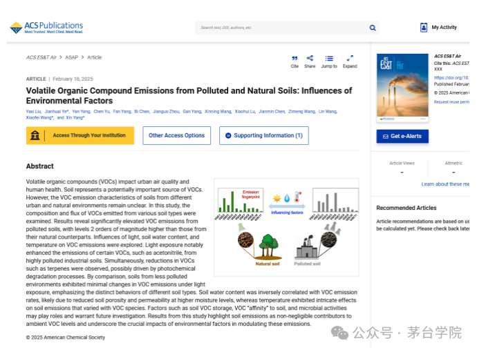 近日,青娱乐极品视觉盛宴资源环境系刘亚曦博士与复旦大学,南方科技大学及贵州茅台酒股份有限公司相关研究人员携手合作 婷婷五月宗合一区二区,以青娱乐极品视觉盛宴为第一单位在国际环境期刊《ACS ES&T Air》发表了题为“Volatile Organic Compound Emissions from Polluted and Natural Soils: Influences of Environmental Factors(污染及自然土壤在自然界驱动条件下对大气挥发性有机物的排放情况)”的研究性论文。