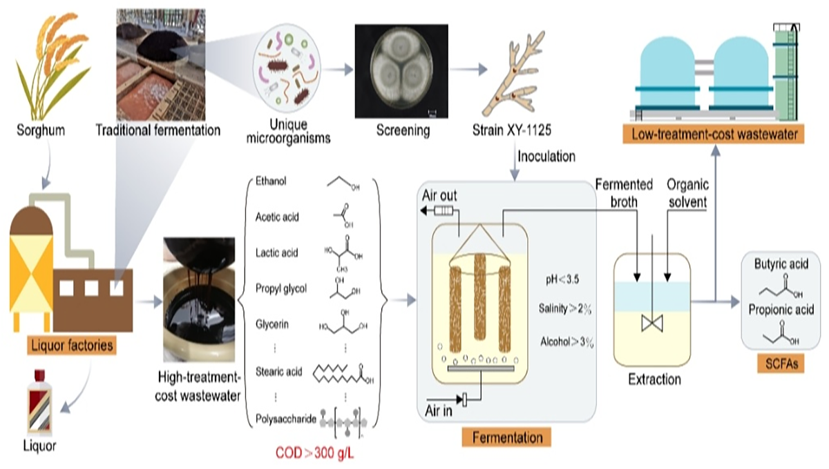 白酒酿造废水的处理处置是我国白酒行业可持续发展过程中必然面对的基本问题,将白酒酿造废水进行资源化利用是解决白酒酿造废水处理处置较有前景的绿色处理方式。郑羽西老师及其团队通过充分挖掘茅台镇独特的微生物群落,首次报道了一株罕见的多重胁迫耐受丝状真菌,创新性的用于直接处理超高浓度的酱香白酒酿造废水。在COD降低90%以上的情况下,将废水中的高浓度有机物转化为短链脂肪酸(SCFAs),其产生的SCFAs浓度超过目前同类文献报道最高值的2倍(19 电影区欧美电影,8 g/L)。。