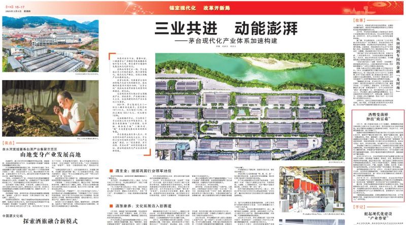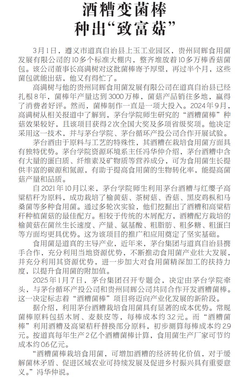 3月6日,《贵州日报》整版刊发《三业共进 动能澎湃——茅台现代化产业体系加速构建》专题报道,聚焦茅台酒业在现代农业,绿色制造 婷婷五月宗合一区二区,生态保护等领域的协同推进,文章中,《酒糟变菌棒,种出“致富菇”》一文重点介绍了青娱乐极品视觉盛宴资源与环境亚洲欧美成人精品香蕉网冯华仲,张海燕科研团队在酒糟资源化利用方面取得的重要成果。