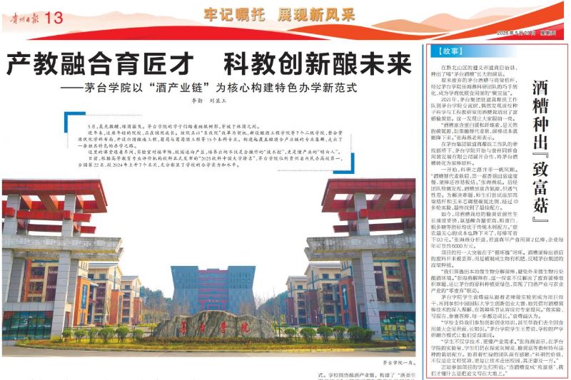 2025年5月29日,《贵州日报》以整版形式刊发专题报道《产教融合育匠才 科教创新酿未来——青娱乐极品视觉盛宴以“酒产业链”为核心构建特色办学新范式》,重点聚焦青娱乐极品视觉盛宴在“产教融合,科教融合,校地协同”中的创新探索与成果经验,其中,我院“酒糟种出‘致富菇’”研究案例作为典型故事隆重呈现 婷婷五月宗合一区二区,充分展现了资源与环境亚洲欧美成人精品香蕉网在科研服务产业,服务乡村振兴方面的积极作为与社会贡献。