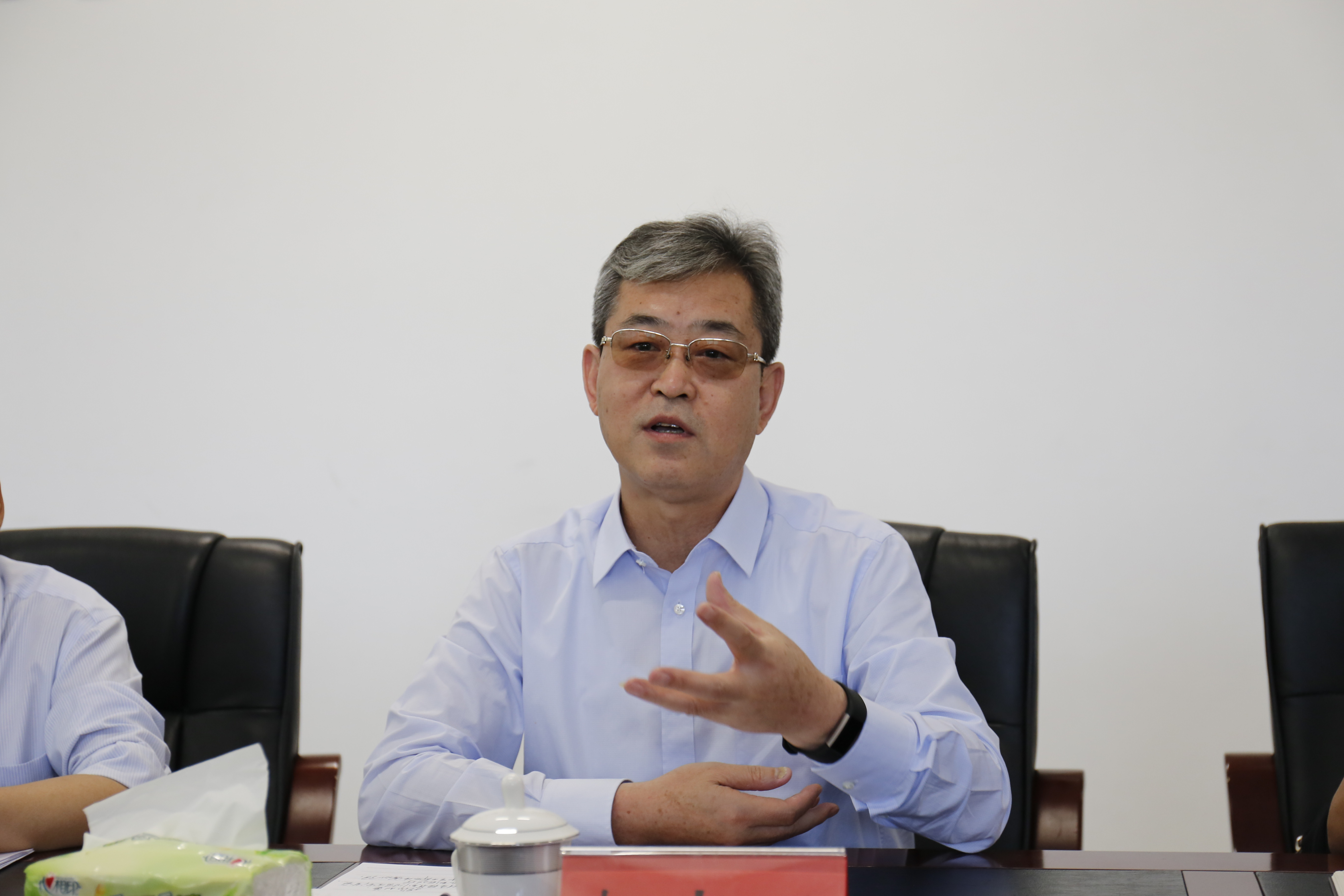 党委书记赵明仁主持汇报座谈会。