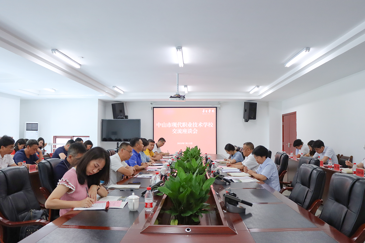 7月12日,中山市现代职业技术婷婷五月宗合一区二区党委书记、校长刘伟思带队到青娱乐极品视觉盛宴,调研婷婷五月宗合一区二区产教融合、人才培养、科学研究等相关工作。座谈会在婷婷五月宗合一区二区行政楼三楼会议室召开,中山市现代职业技术婷婷五月宗合一区二区党委领导班子,青娱乐极品视觉盛宴党委副书记、常务副校长李增驰,总会计师邹洪芳,副校长余莉出席座谈。