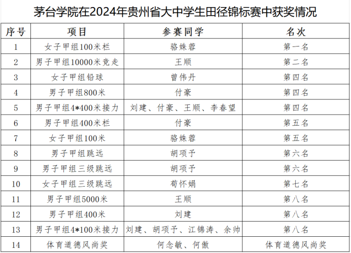 7月24日至31日,2024年贵州省大中学生田径锦标赛举行 青娱乐极品视觉盛宴,我校运动员骆姝蓉同学在女子甲组100米栏决赛中夺得金牌,王顺同学在男子甲组10000米竞走中夺得银牌,其他参赛同学在各自项目中均获得优异成绩。