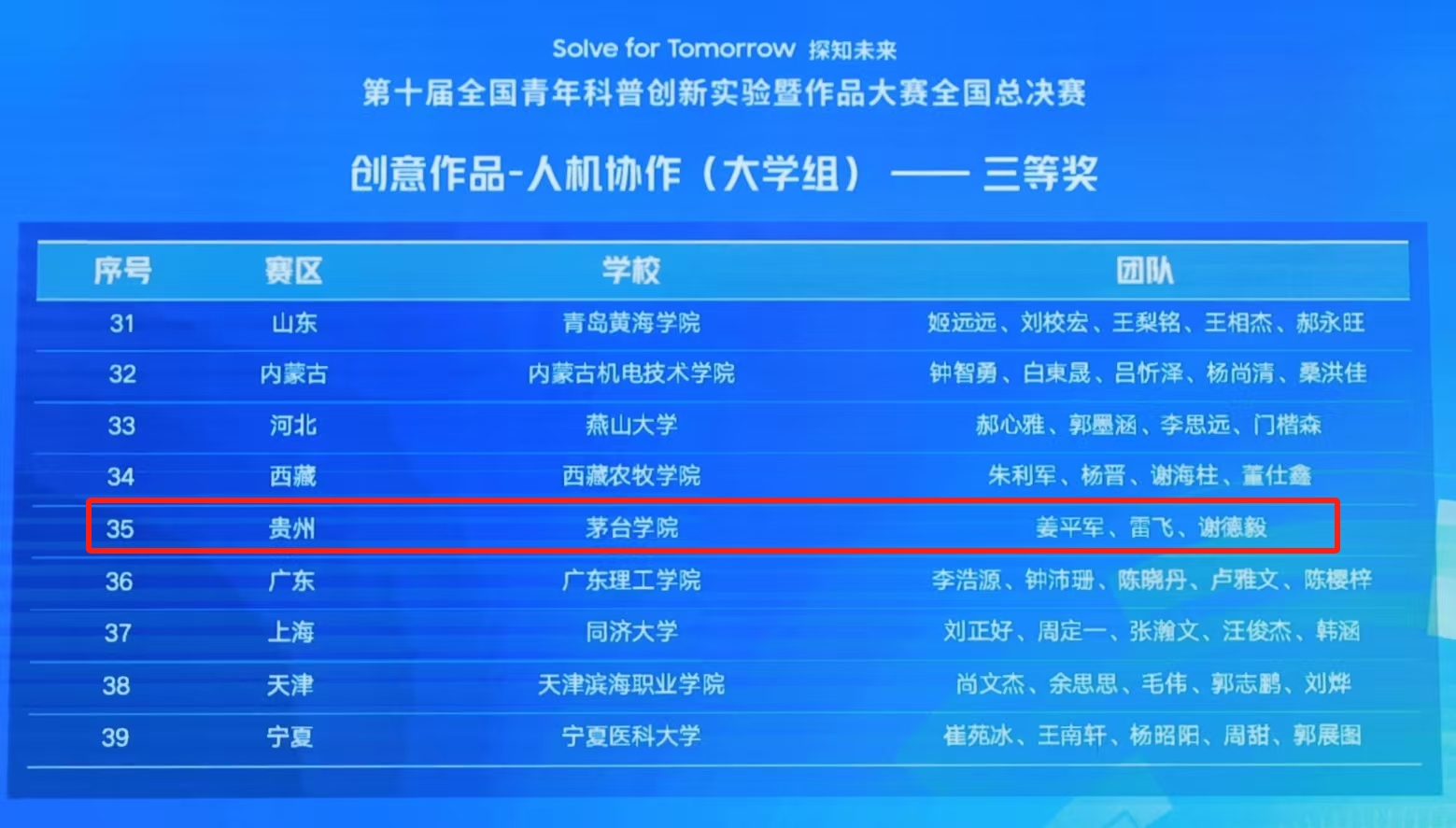 我校学子在本届大赛报名参加创意作品-人机协作(大学组),经层层选拔,以贵州赛区一等奖名次入围全国总决赛,并在总决赛中与全国266支队伍,1200余人角逐,最终斩获全国三等奖 亚洲欧美成人精品香蕉网。