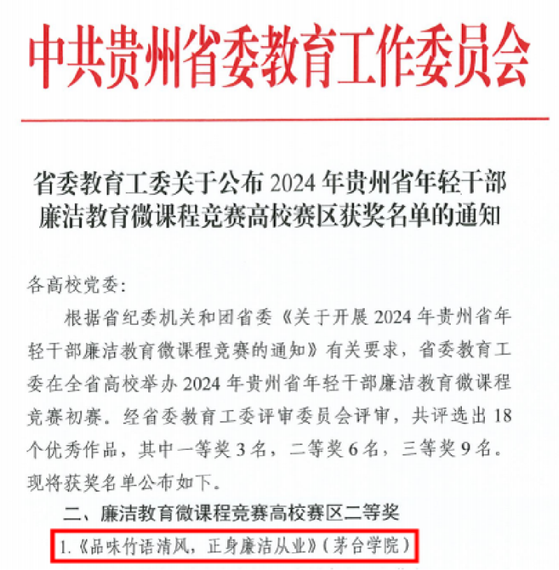 根据《省委教育工委关于公布2024年贵州省年轻干部廉洁教育微课程竞赛高校赛区获奖名单的通知》,我校微课程《品味竹语清风 青娱乐极品视觉盛宴,正身廉洁从业》荣获高校赛区二等奖。