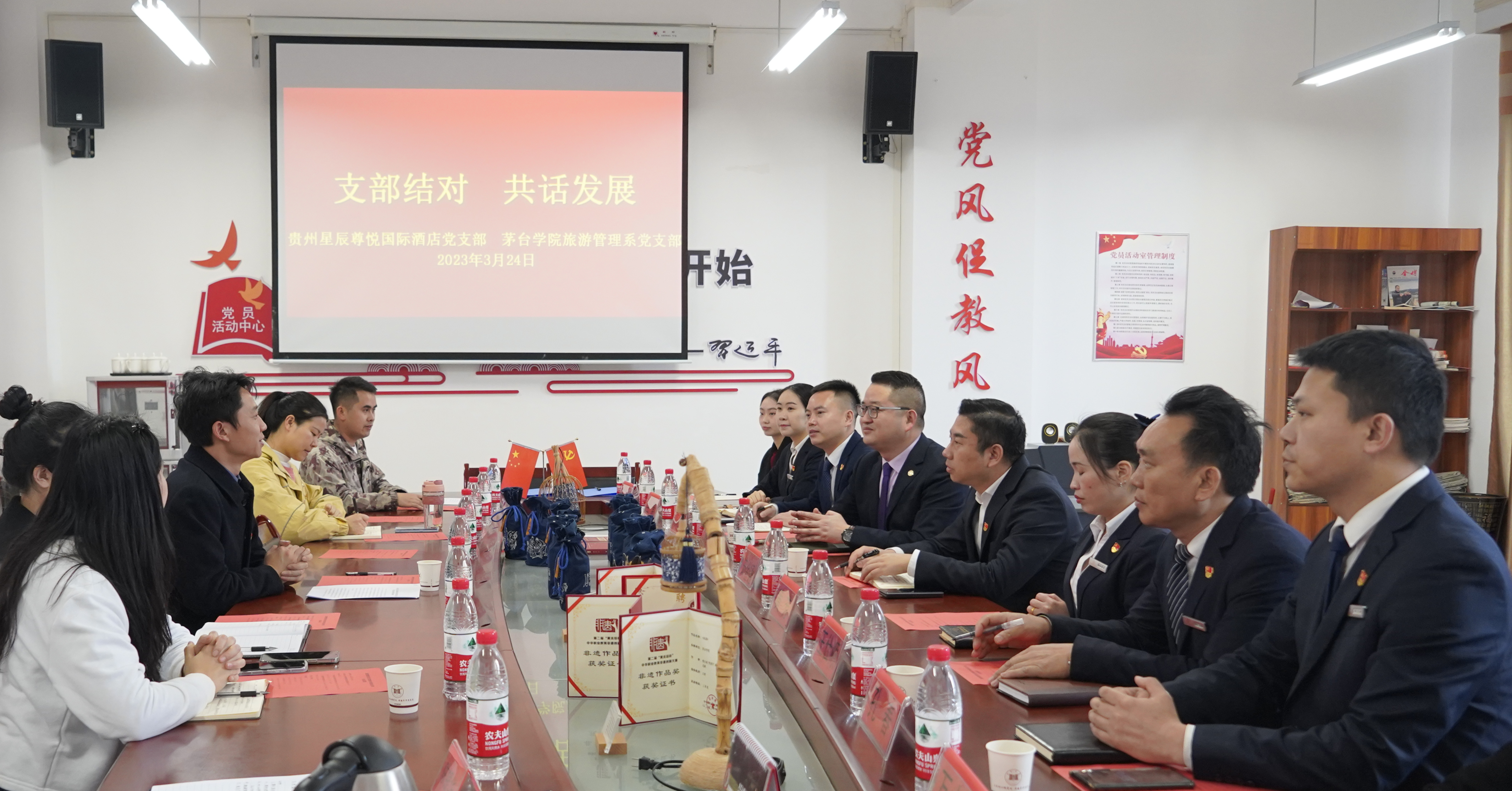 为深入学习贯彻习近平新时代中国特色社会主义思想,推动党支部建设引领业务工作高质量发展。2023年3月24日,旅游管理系党支部与贵州星辰尊悦国际酒店党支部开展结对共建活动,活动以座谈会形式在青娱乐极品视觉盛宴A1-321室开展,旅游管理系党支部书记欧信忠主持,贵州爽净集团党委副书记、工会主席、星辰尊悦国际酒店党支部书记闵金通,双方支委及党员代表参加了活动。